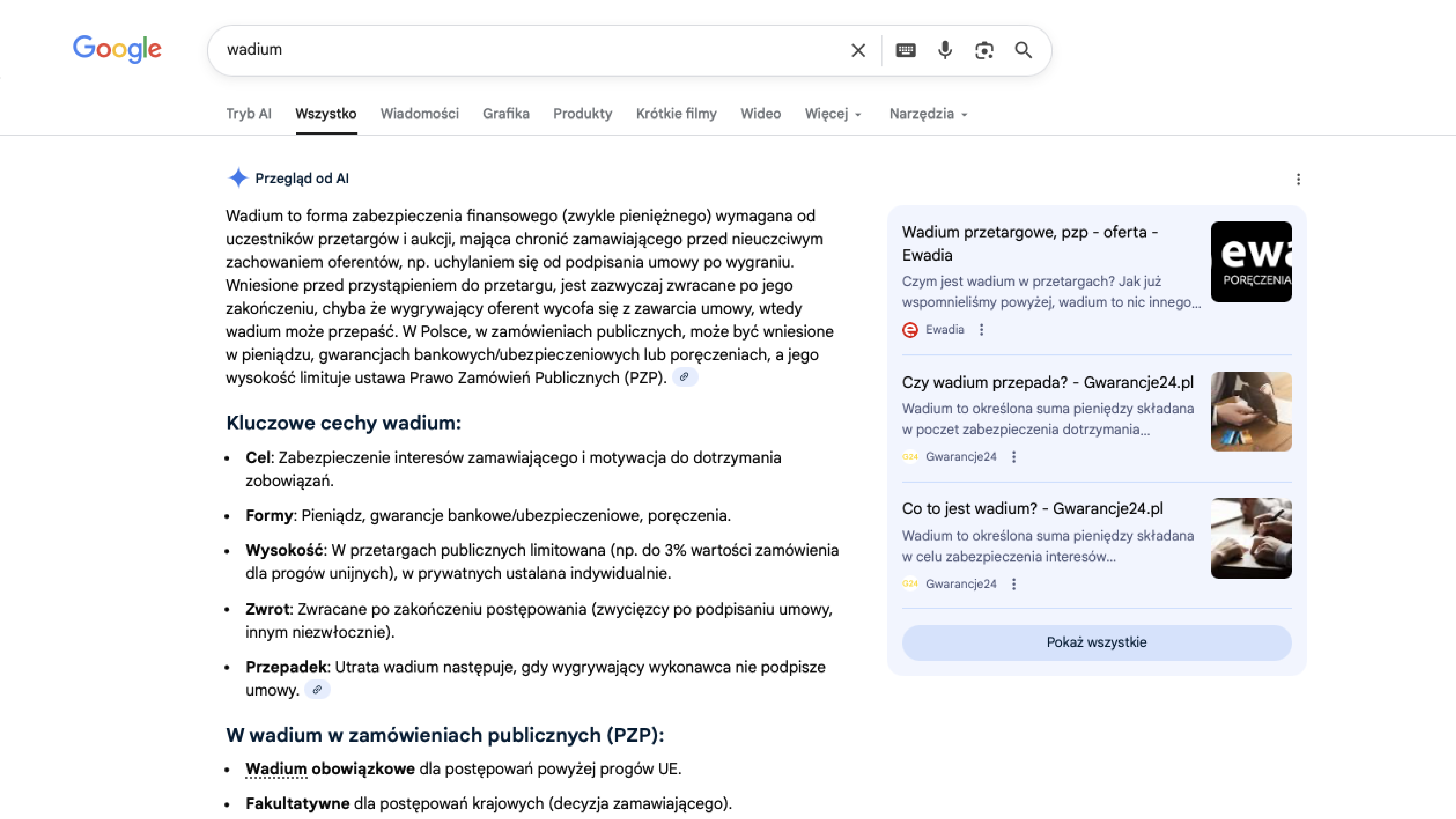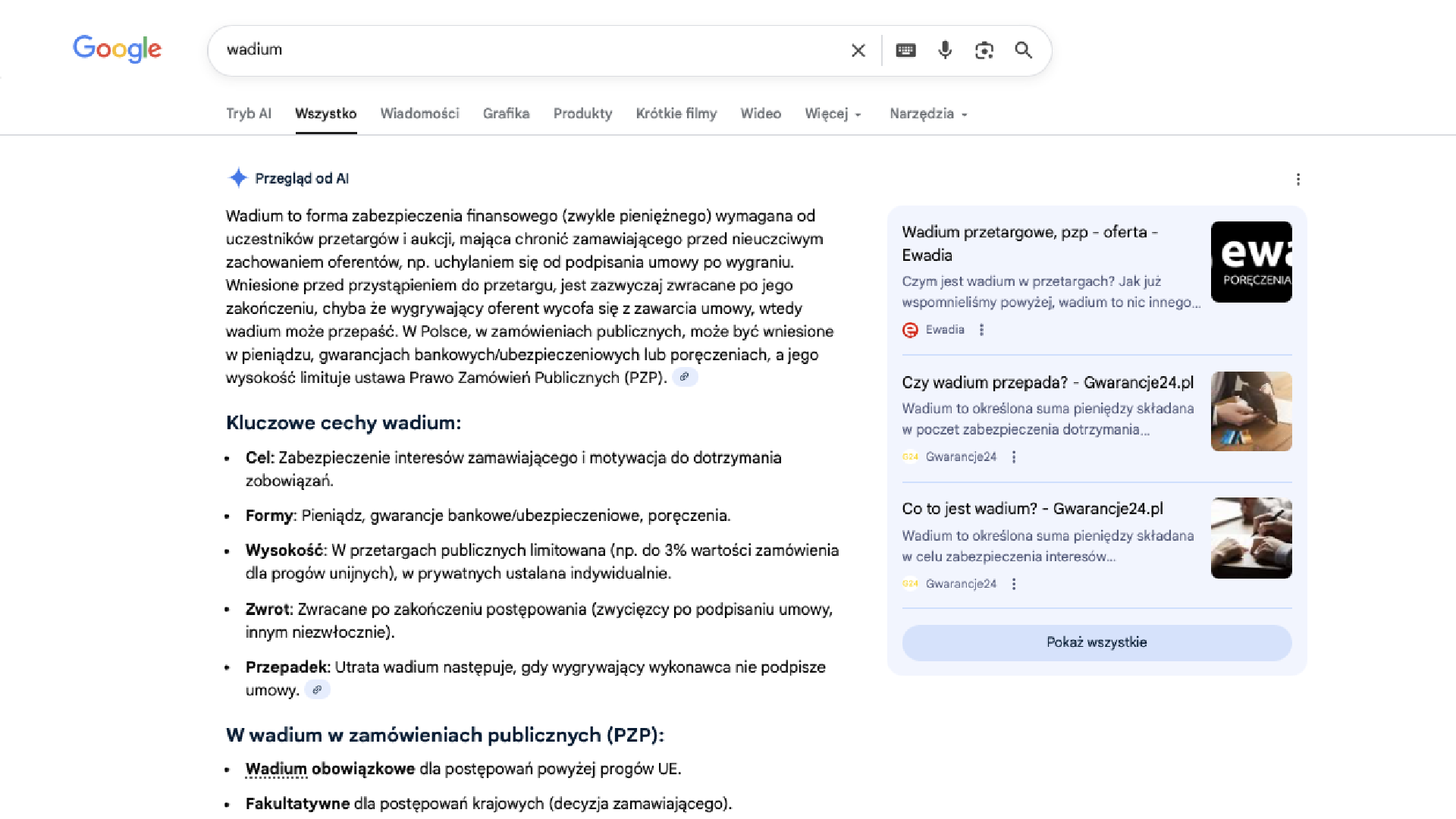 "Wadium to forma zabezpieczenia finansowego (zwykle pieniężnego) wymagana od uczestników przetargów i aukcji, mająca chronić zamawiającego przed nieuczciwym zachowaniem oferentów, np. uchylaniem się od podpisania umowy po wygraniu. Wniesione przed przystąpieniem do przetargu, jest zazwyczaj zwracane po jego zakończeniu, chyba że wygrywający oferent wycofa się z zawarcia umowy, wtedy wadium może przepaść. W Polsce, w zamówieniach publicznych, może być wniesione w pieniądzu, gwarancjach bankowych/ubezpieczeniowych lub poręczeniach, a jego wysokość limituje ustawa Prawo Zamówień Publicznych (PZP)."